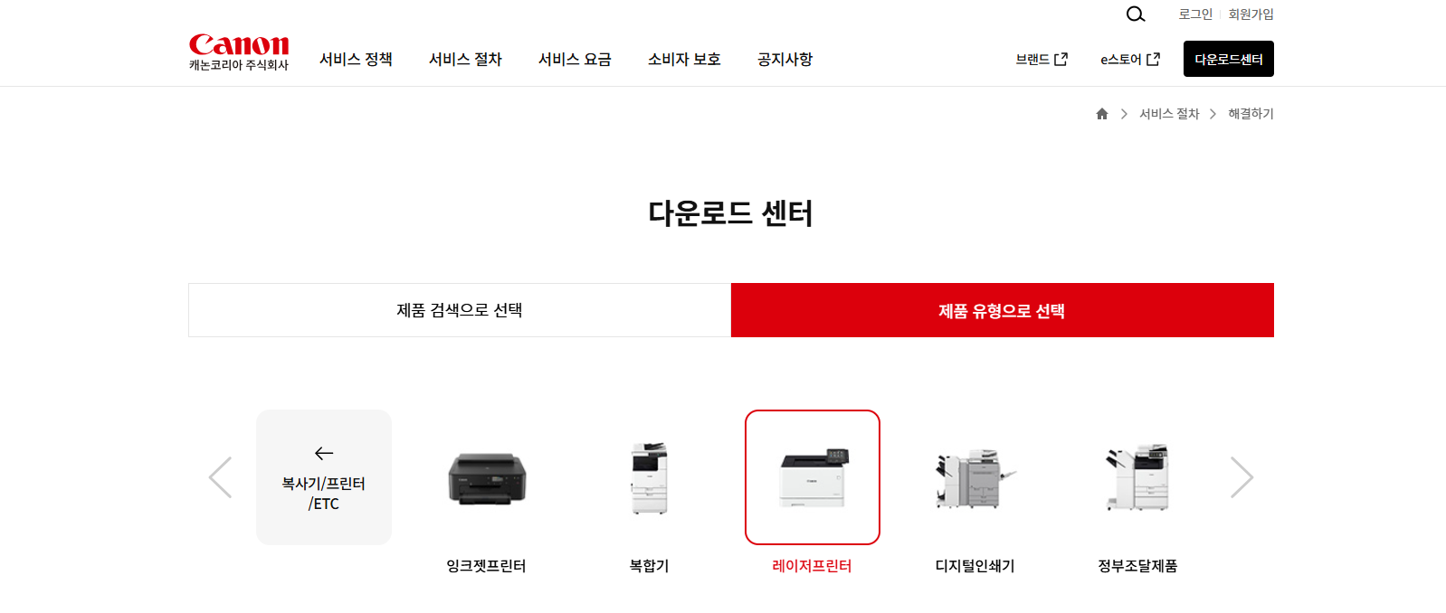 캐논 드라이버는 반드시 캐논코리아 공식 홈페이지에서 다운로드해야 합니다. 포털 사이트에서 '캐논 드라이버 다운로드'라고 검색하면 상단에 공식 홈페이지가 노출됩니다.