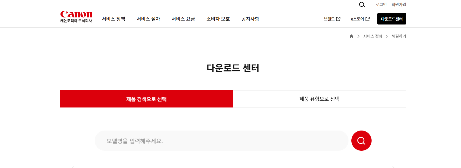 홈페이지 상단에 있는 검색창에 사용 중인 프린터의 모델명을 정확하게 입력합니다. 예: 'PIXMA TS8190', 'LBP6030', 'MF244dw' 등.