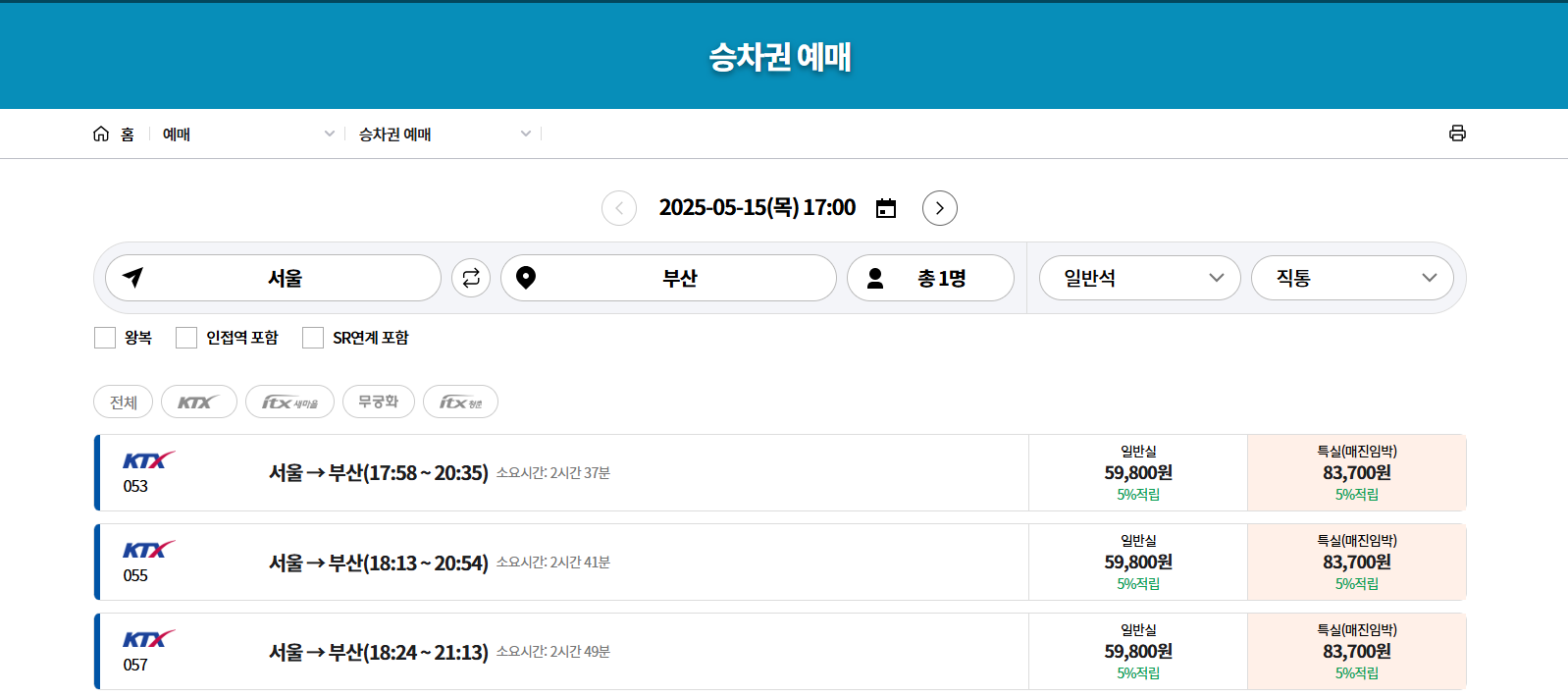 - KTX, ITX, 새마을호, 무궁화호 등 열차 예매