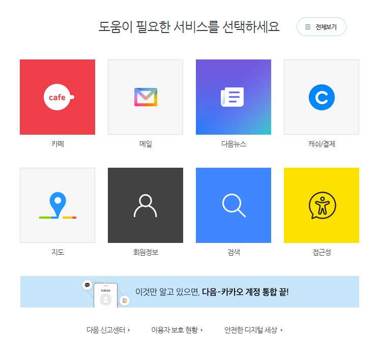 메일, 카페, 블로그, 뉴스, 쇼핑, 웹툰 등 다양한 서비스를 제공하는 다음은 각 서비스마다 고객 지원 경로가 다를 수 있어, 이용자 입장에서는 어떤 경로로 문의해야 할지 혼란스럽습니다.