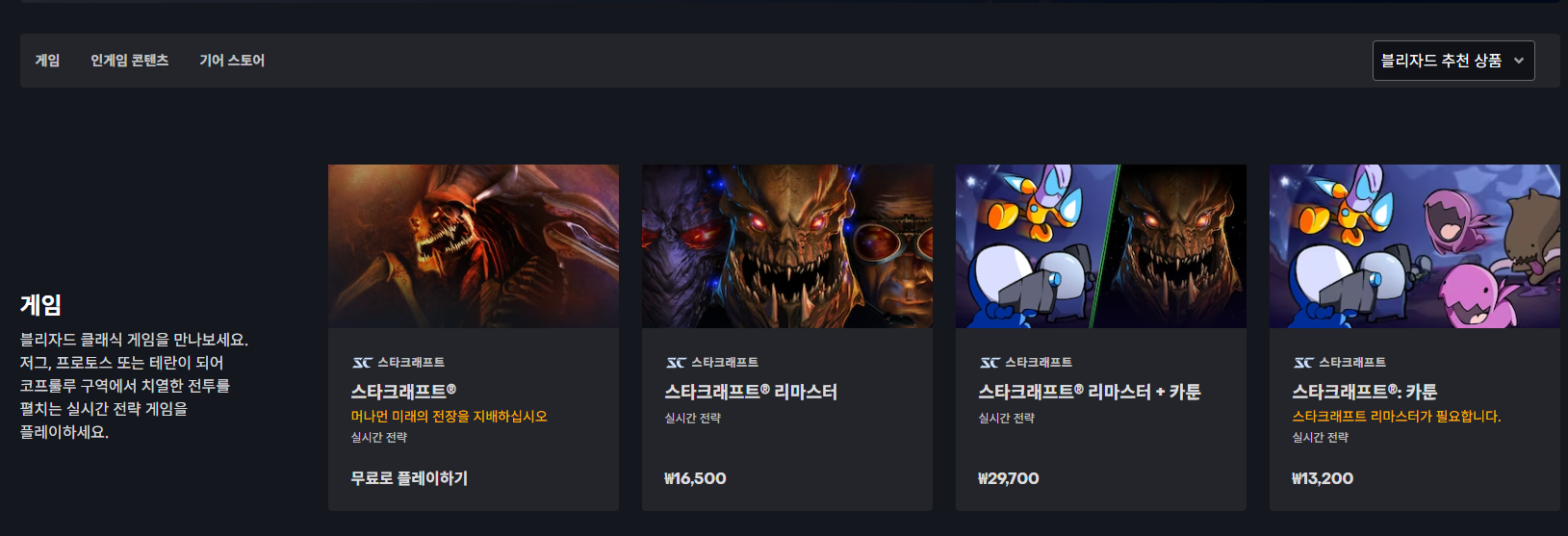 오리지널 게임을 무료로 즐기고 싶다면, 리마스터가 아닌 '스타크래프트 앤솔로지' 항목을 선택해야 합니다.