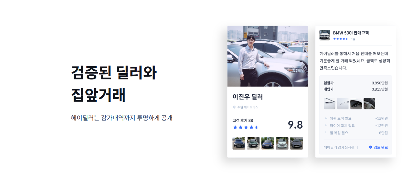 헤이딜러는 전국 수천 명의 중고차 딜러와 차량 판매 희망자를 연결해주는 온라인 중고차 경매 플랫폼입니다. 판매자는 복잡한 절차 없이 차량 정보를 입력하고, 딜러들이 경쟁 입찰하는 구조로 차량을 판매할 수 있습니다.