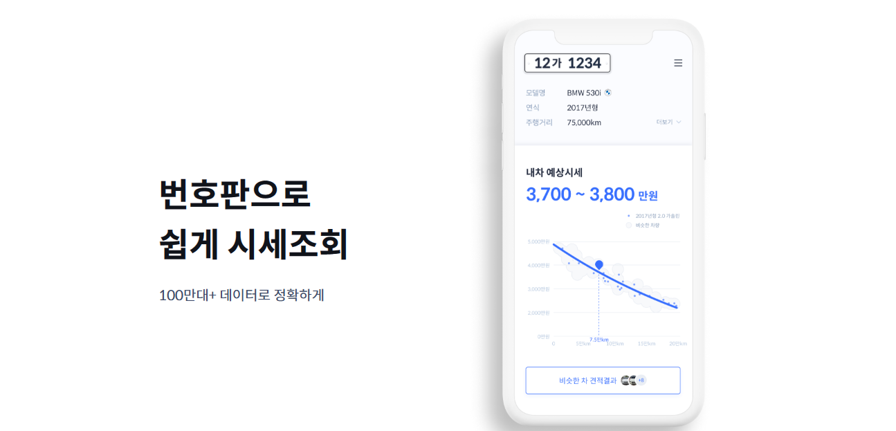 입력된 차량 정보를 바탕으로 실시간 시세 결과가 제공됩니다. 이때 제시되는 금액은 최근 100만 건 이상의 실거래 데이터를 기반으로 산출된 정보입니다.