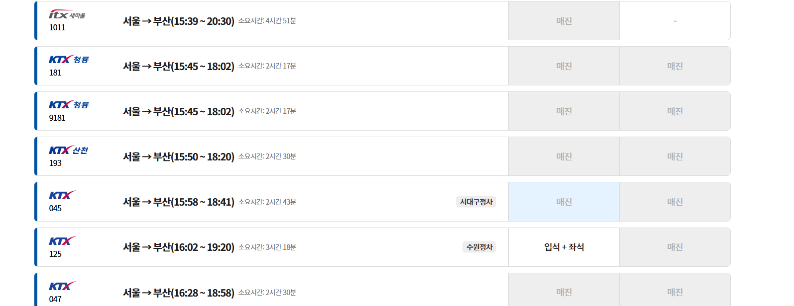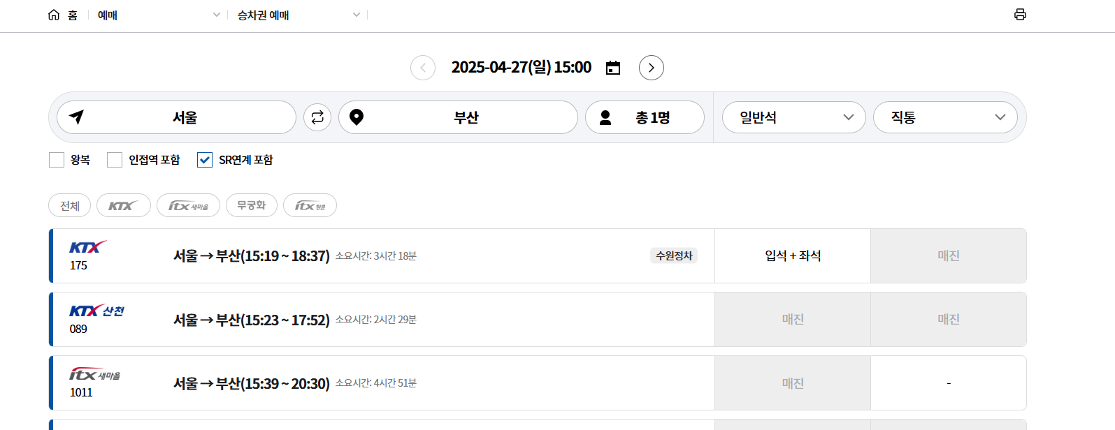 원하는 열차와 좌석을 선택해 예매를 완료하면 됩니다.