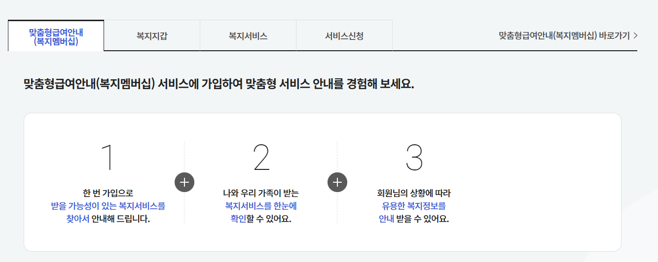 다만, 맞춤형 서비스 추천이나 온라인 신청을 위해서는 복지멤버십 가입이 필요합니다.
