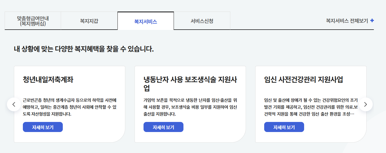 또한 소득과 재산 상황에 따라 개인 맞춤형 복지 안내도 받을 수 있어, 필요한 정보를 빠르고 정확하게 확인할 수 있습니다.